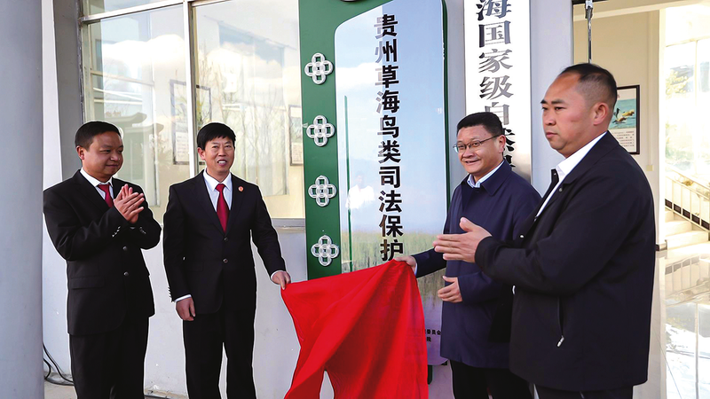 “贵州草海鸟类司法保护基地”牌匾在草海之畔正式揭牌。(毕节中院供图) ■记者 杨情丽
