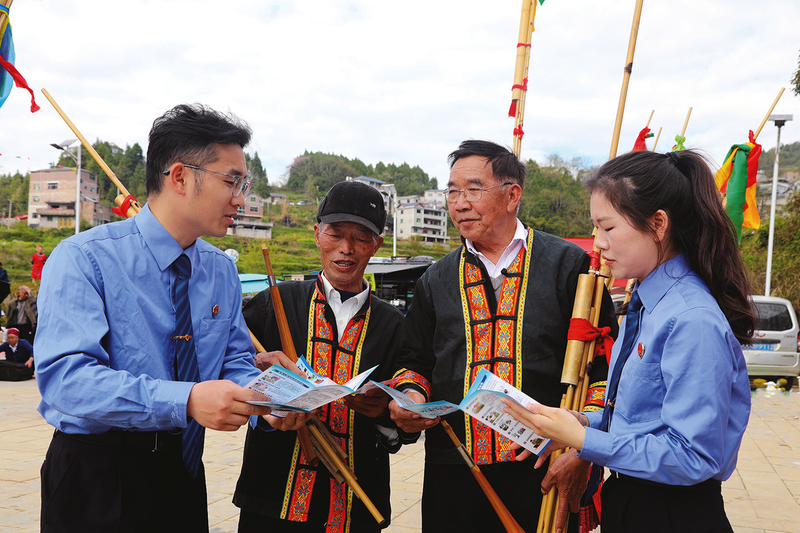 近日,施秉县人民检察院干警以杨柳塘镇屯上村举行芭梭芦笙会暨刻道文化节为契机,深入活动现场开展法治宣传活动,通过发放法治宣传手册、现场答疑解惑等形式,向群众讲解民法典、森林防火、防范养老诈骗、未成年人保护等知识,推动法治理念深入人心。