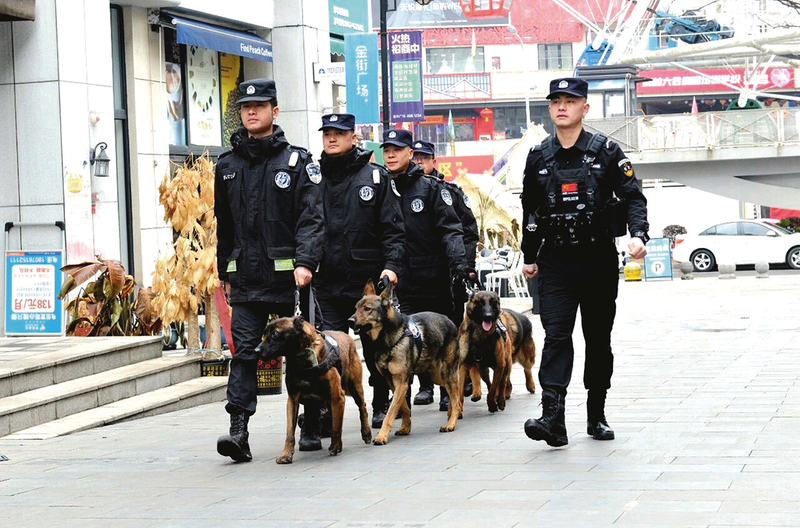 警犬与训导员一起在街面巡逻。 ■记者 贾华