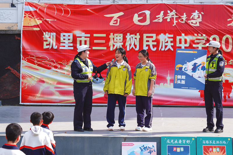 4月10日,凯里市公安局交通管理大队组织宣传人员走进三棵树民族中学,开展交通安全宣传活动。活动通过趣味互动、案例讲解、知识问答等形式,向师生宣传拒绝乘坐“违法车辆”、防范车辆盲区风险及“一盔一带”等交通安全知识。