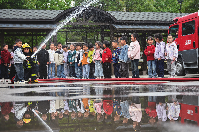 近日,开阳县各中小学、幼儿园组织开展“全民国家安全教育日”主题活动,通过应急逃生演练、体验消防装备等方式,向孩子们普及安全知识,提高大家的安全防范意识和自我保护能力。图为开阳县第二幼儿园的孩子们在消防员指导下体验使用消防水枪。