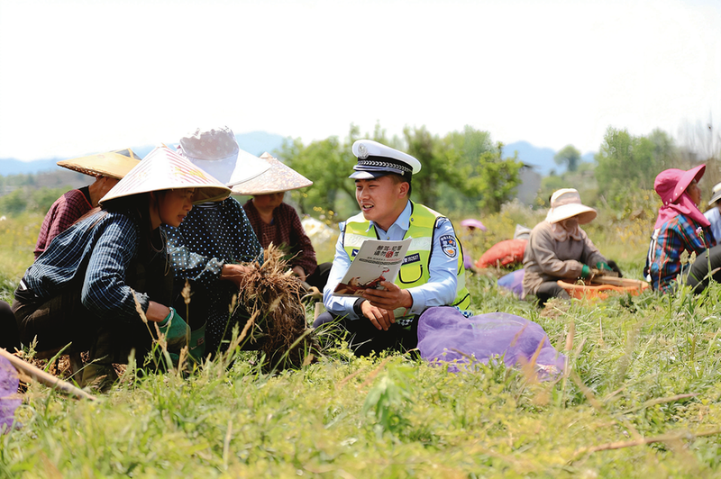 4月19日,黄平县公安局交管大队民警辅警走进旧州镇寨勇村,利用村民田间劳作空闲时间,通过现场咨询、发放宣传资料、面对面讲解等形式,向村民普及春耕春播时节出行注意事项和交通安全常识,提升村民安全防范意识。