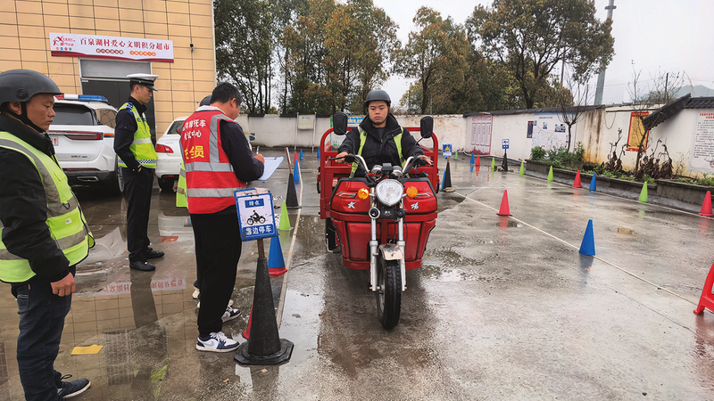 毕节市公安局百里杜鹃分局交巡警大队车管所则抢抓农时,将摩托车驾驶证考试“送”到仁和乡群众家门口。活动前期,车管所主动对接乡镇、村社,摸排群众考证需求,依托乡村警务微信群、“大喇叭”广泛宣传,科学设置考场、优化报名流程,实现“群众点单、公安送考”。考试现场,民警严格核验身份,规范设置理论考试和技能实操区域,坚持“标准不降、程序不减、服务更优”,为群众提供体检、报名、考试一站式服务。